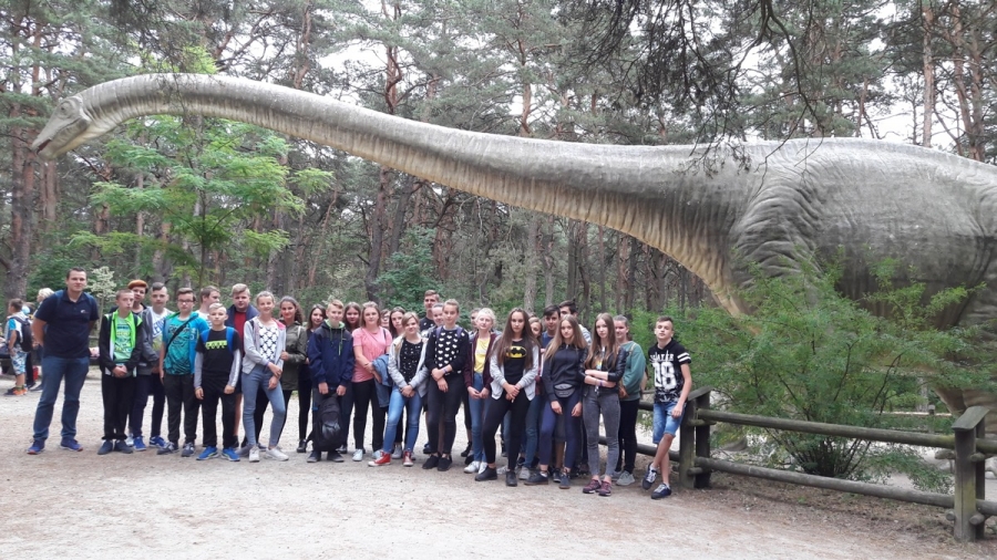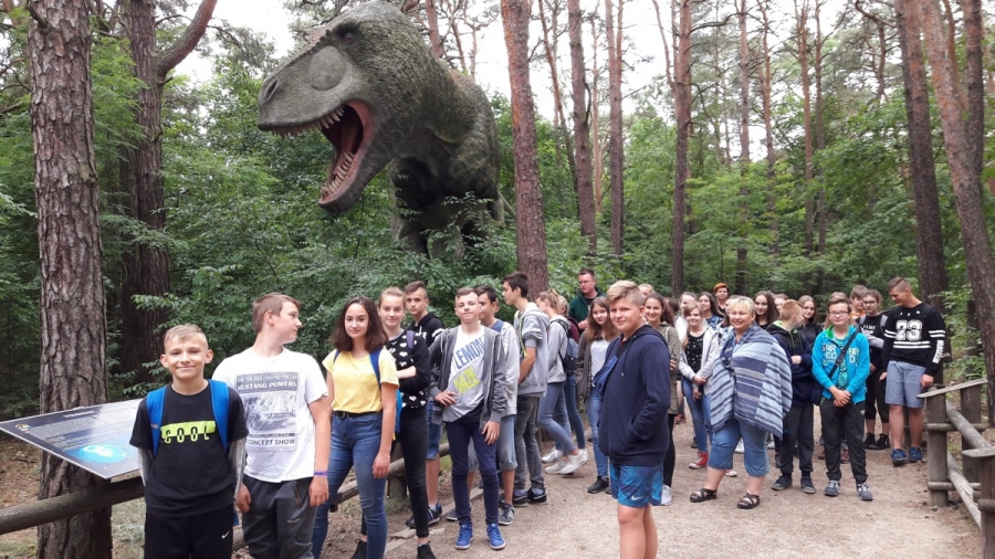 Dnia 13 czerwca 2018 roku uczniowie klas siódmych wraz z wychowawcami i panią dyrektor wybrali się na wycieczkę dydaktyczną do Solca Kujawskiego, gdzie odwiedzili park dinozaurów. Wizytę w JuraParku rozpoczęli od spotkania z przewodnikiem. Wraz z nim uczniowie przeszli niezwykle ciekawą ścieżkę dydaktyczną ukazującą różne gatunki dinozaurów w skali 1:1 z trzech okresów w dziejach Ziemi: triasu, jury i kredy. Uczniowie mogli zaobserwować rozwój tych niezwykłych gadów od momentu pojawienia się 250 mln lat temu do momentu ich wymierania, który nastąpił 65 mln lat temu. Następnie wszyscy przeszli do Muzeum Ziemi, gdzie zapoznali się z dziejami rozwoju życia na Ziemi od momentu powstania pierwszych organizmów wodnych do momentu pojawienia się człowieka. Wiedzę uzyskaną podczas zwiedzania muzeum uczniowie mogli rozwinąć w trakcie lekcji muzealnej pt. Pochodzenie człowieka. Po zakończeniu części dydaktycznej na uczestników wycieczki czekało wiele atrakcji m.in. seans w kinie 5D oraz ekstremalne przeżycia w parku rozrywki, w tym przejażdżki rollercosterem, statkiem piracki oraz karuzelą łańcuchową. W drodze powrotnej uczniowie odwiedzili Muzeum Mydła i Historii Brudu w Bydgoszczy, gdzie samodzielnie wyrobili mydło oraz zapoznali się z różnymi aspektami związanymi z higieną (lub jej brakiem) wśród swoich przodków.