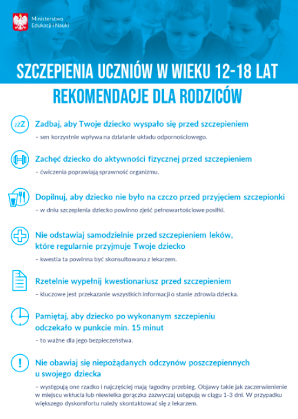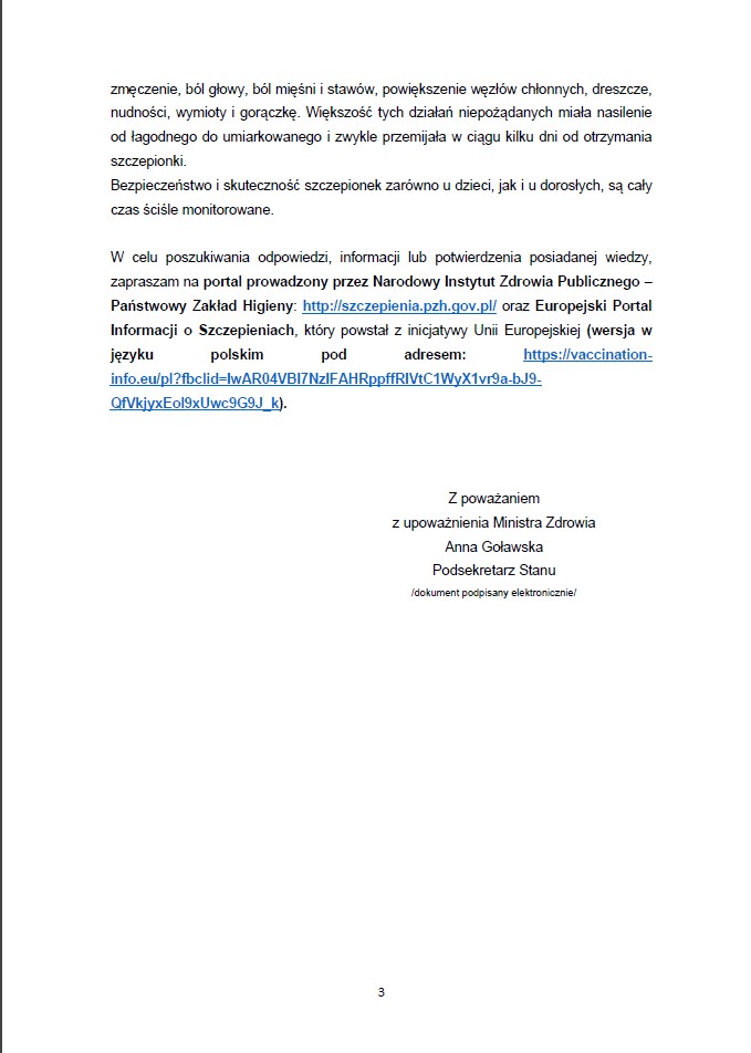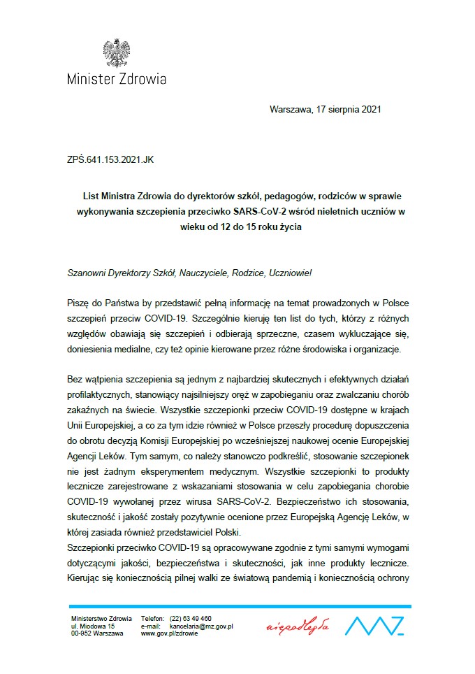 List Ministra Zdrowia do dyrektorów szkół, pedagogów, rodziców w sprawie wykonywania szczepienia przeciwko SARS-CoV-2 wśród nieletnich uczniów w wieku od 12 do 15 roku życia