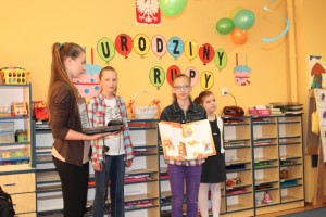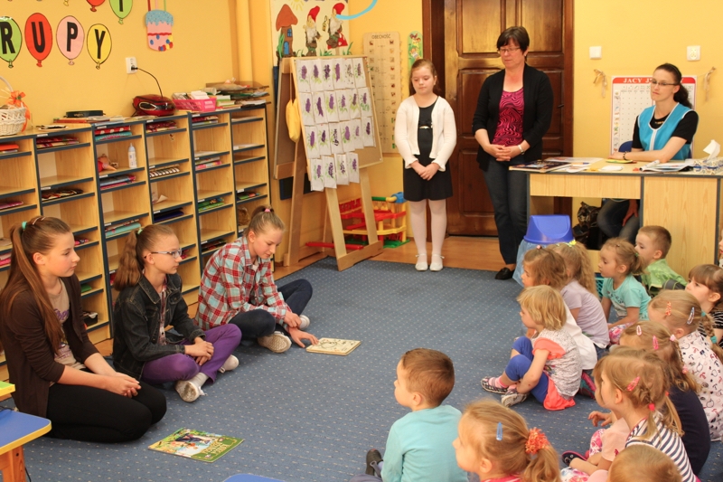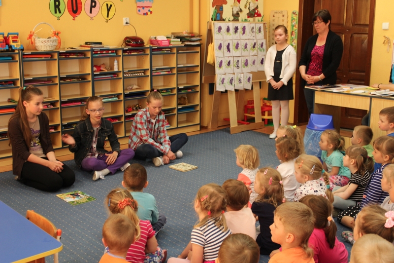Dnia 11.05.2016 r. grupa uczniów reprezentująca Koło Przyjaciół Książki pod kierunkiem p. Aldony Kalupy i p. Teresy Lewandowskiej udała się do pobliskiego przedszkola w Połajewie. Celem wizyty było przedstawienie dzieciom książki w różnych formatach, ukazanie sposobów poszanowania książki oraz przeczytanie wybranych wierszy. Przedszkolaki w skupieniu słuchali przedstawienia oraz chętnie odpowiadali na zadawane im pytania.