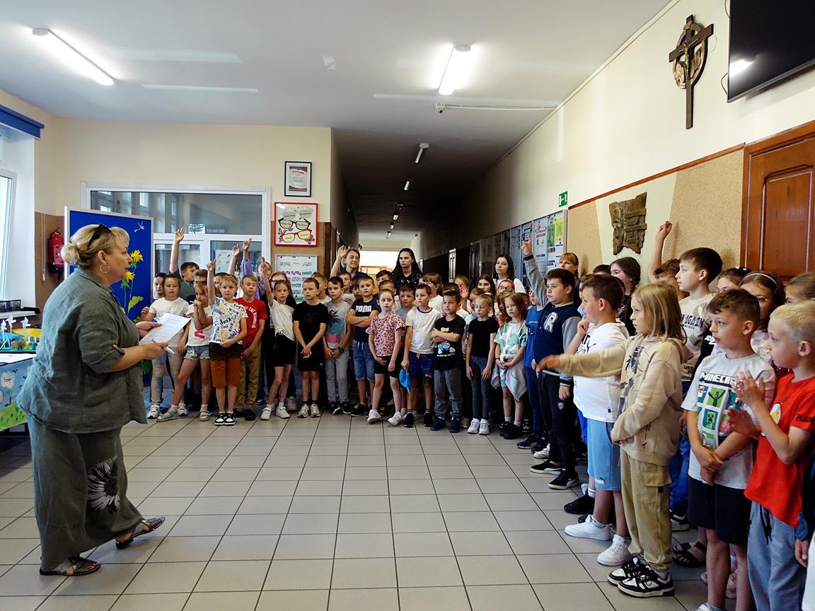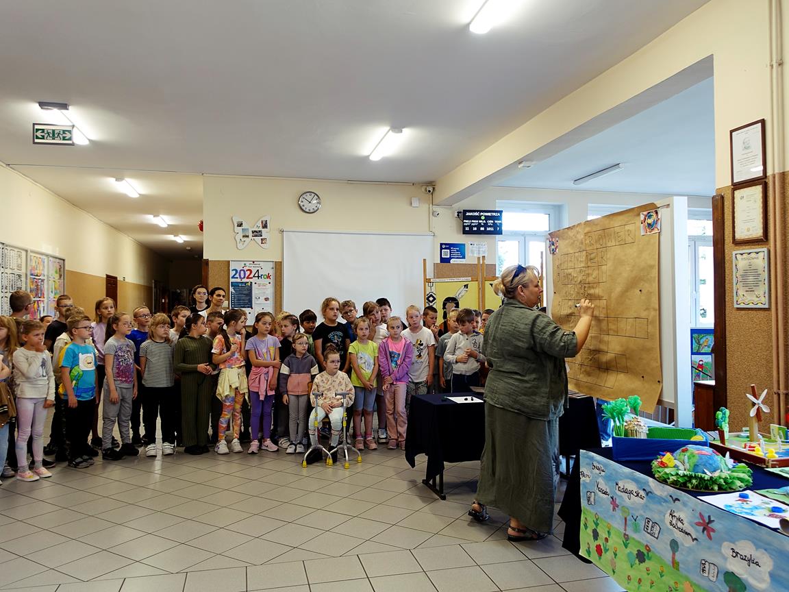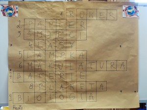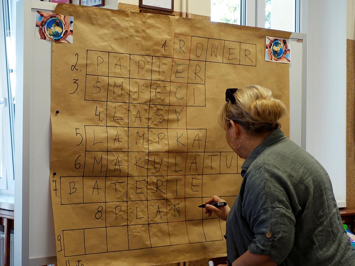 I-III rozwiązywali krzyżówkę o tematyce ekologicznej, której hasłem było słowo RECYKLING. W tym dniu pani dyrektor wręczyła