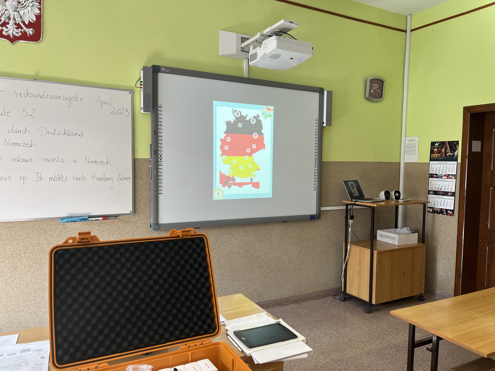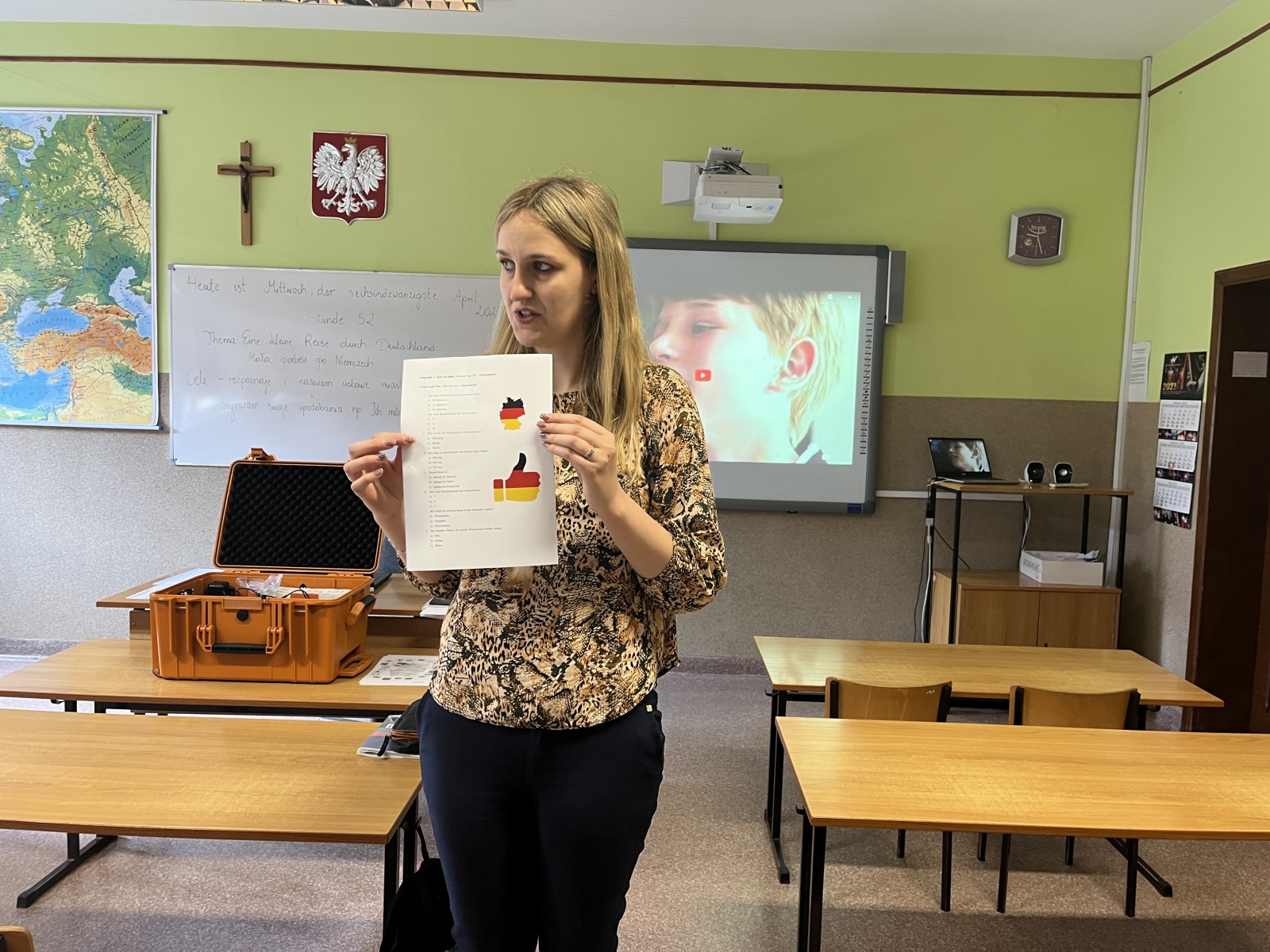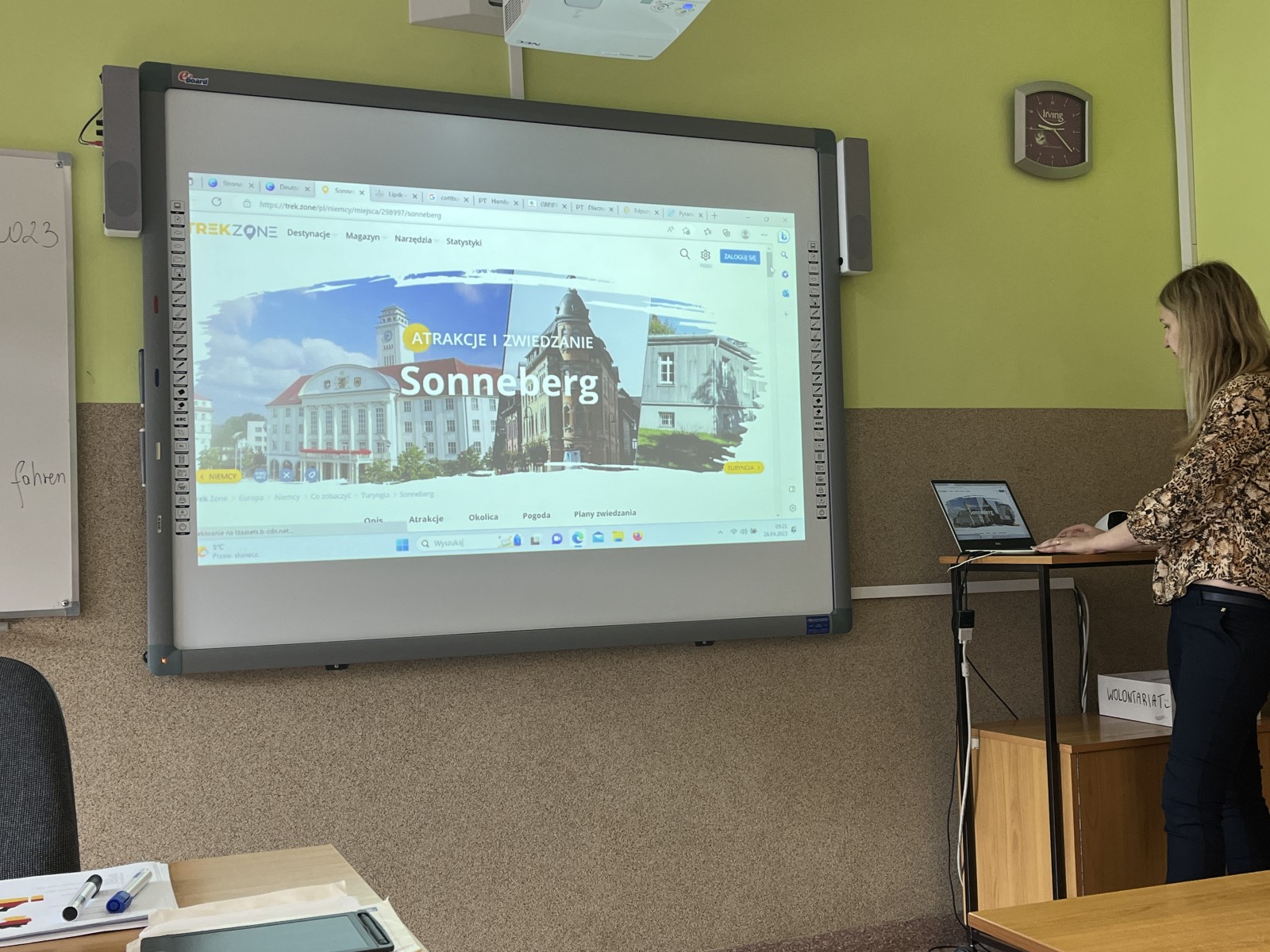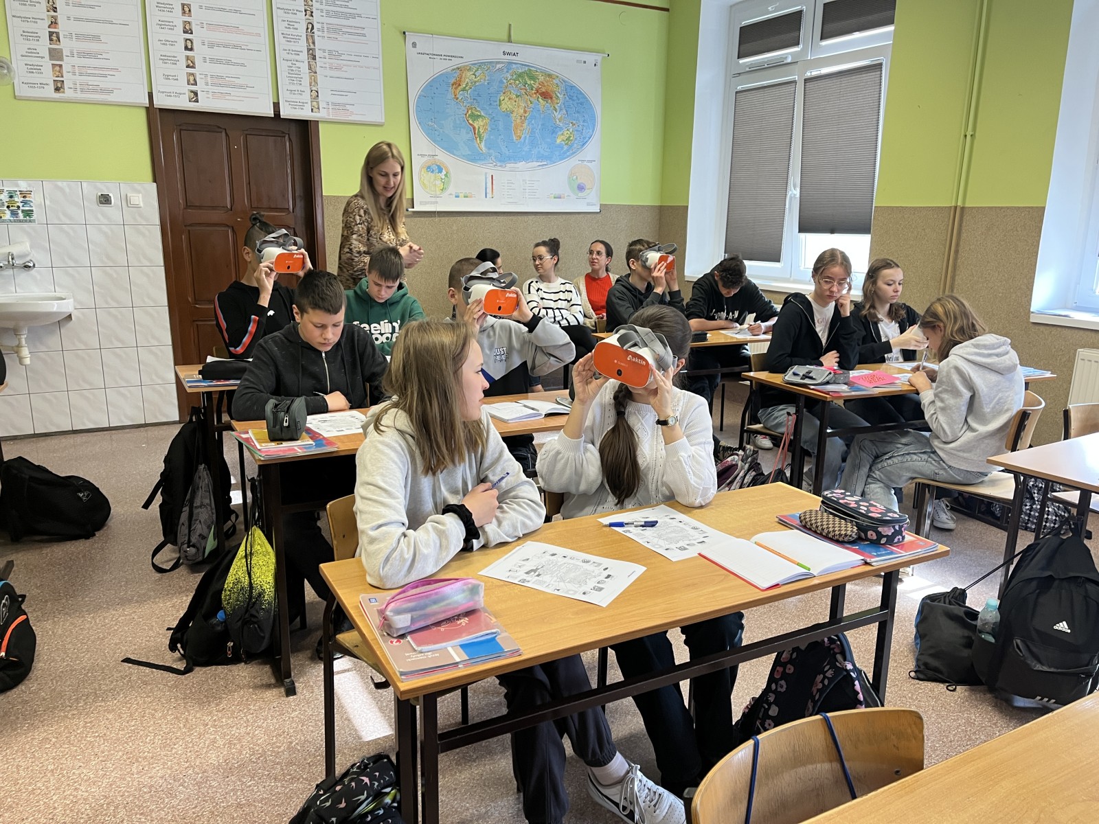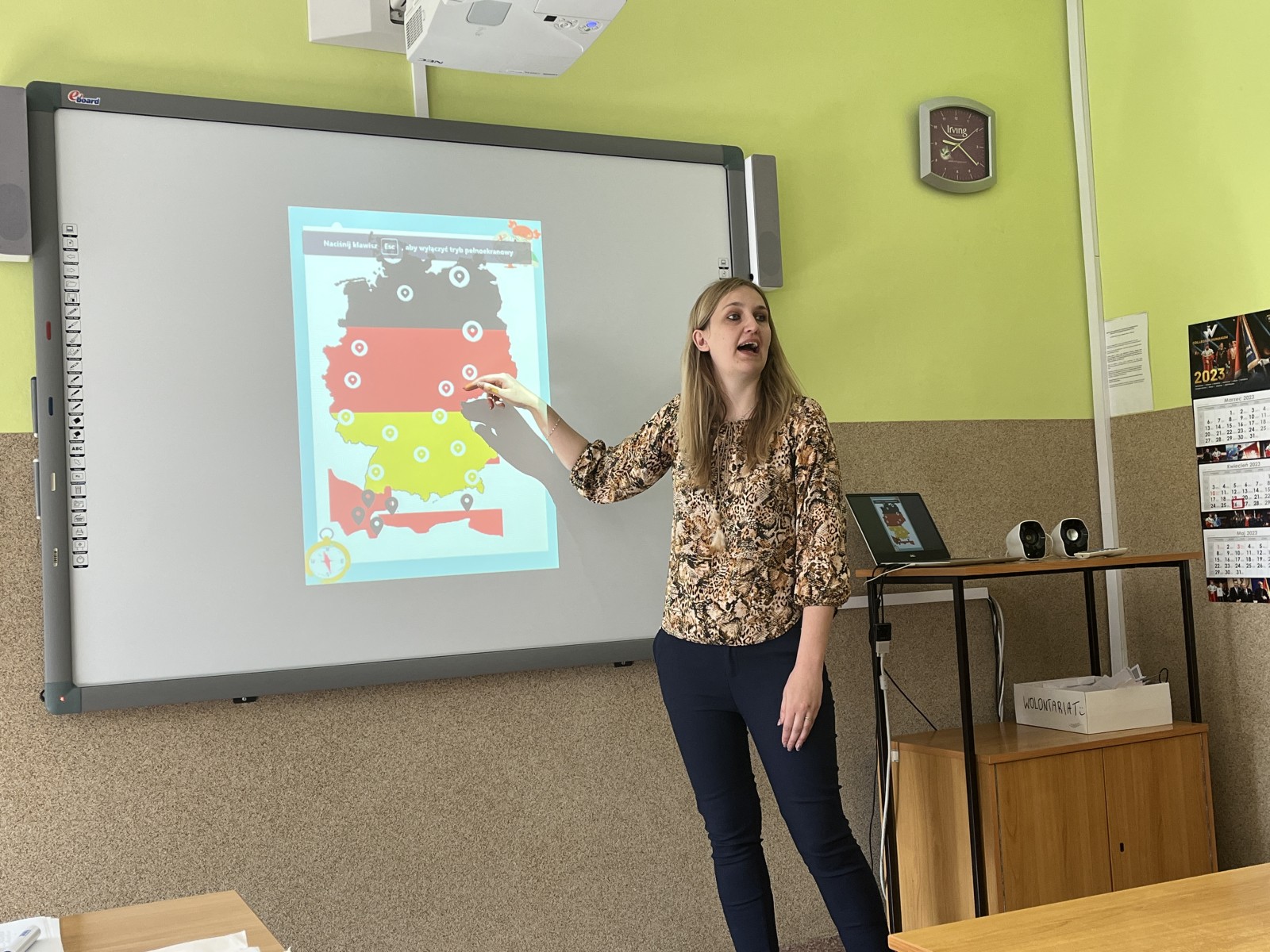 W dniu 26 kwietnia 2023 r. odbyła się lekcja otwarta z języka niemieckiegodla nauczycieli w klasie VIIIb. Celem zajęć było zaciekawienie uczniów krajem naszych zachodnich sąsiadów. Uczniowie przenieśli się do wirtualnej mapy Niemiec, dzięki pozyskanym w ramach programu "Laboratoria przyszłości" okularom ClassVR Premium i odczytywali nazwy miast. Każde z nich może poszczycić się piękną architekturą i wieloma zabytkami. Kolejnym zadaniem był quiz do filmu " Was ist was- TV - Deutschland" w aplikacji Edpuzzle. Uczniowie dowiedzieli się wielu ciekawostek o Niemczech. Odpowiadali na pytania o powierzchni kraju, najwyższym szczycie, najdłuższej rzece itd. Ewaluacja dokonana pod koniec zajęć dowiodła, iż uczniowie z pewnością pogłębili swoją wiedzę geograficzną i historyczną o naszych zachodnich sąsiadach. Na lekcji wykorzystano materiały nabyte podczas kursy metodycznego w Ratyzbonie w ramach projektu Erasmus+.