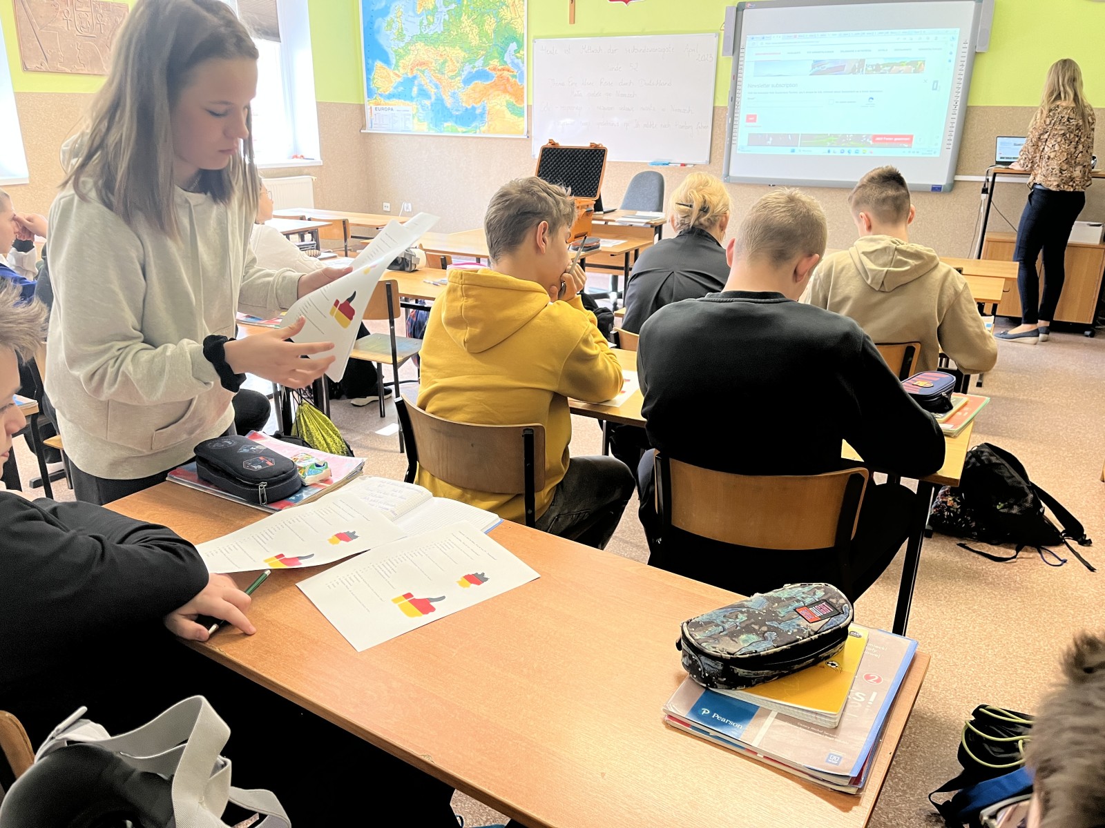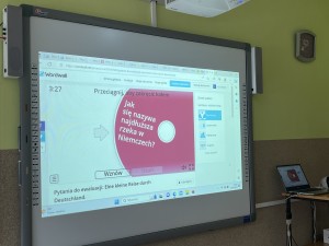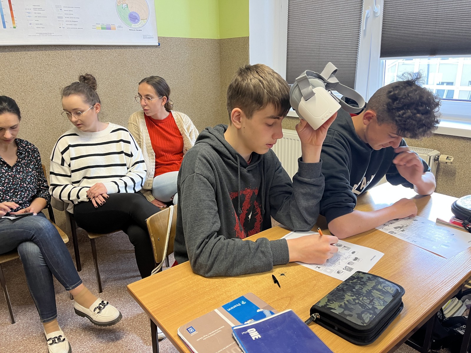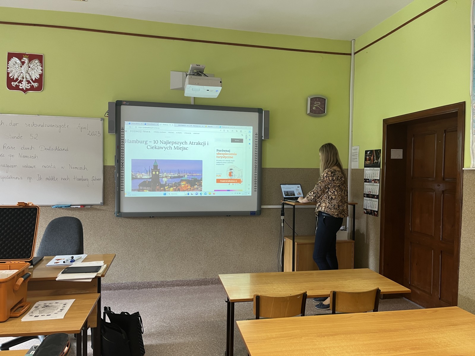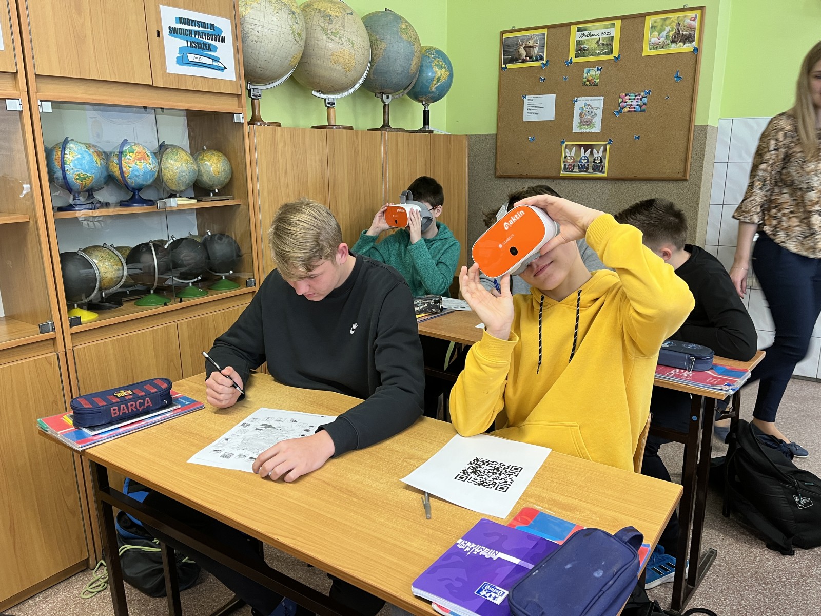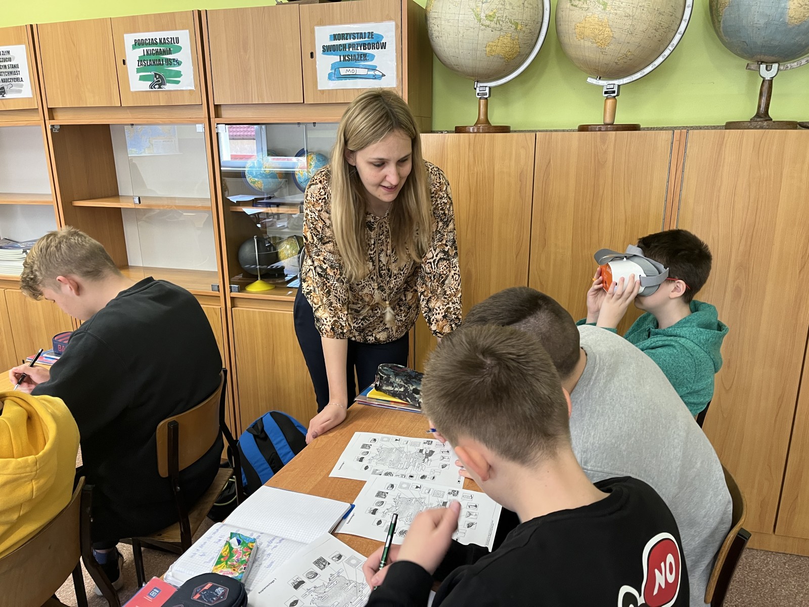 W dniu 26 kwietnia 2023 r. odbyła się lekcja otwarta z języka niemieckiegodla nauczycieli w klasie VIIIb. Celem zajęć było zaciekawienie uczniów krajem naszych zachodnich sąsiadów. Uczniowie przenieśli się do wirtualnej mapy Niemiec, dzięki pozyskanym w ramach programu "Laboratoria przyszłości" okularom ClassVR Premium i odczytywali nazwy miast. Każde z nich może poszczycić się piękną architekturą i wieloma zabytkami. Kolejnym zadaniem był quiz do filmu " Was ist was- TV - Deutschland" w aplikacji Edpuzzle. Uczniowie dowiedzieli się wielu ciekawostek o Niemczech. Odpowiadali na pytania o powierzchni kraju, najwyższym szczycie, najdłuższej rzece itd. Ewaluacja dokonana pod koniec zajęć dowiodła, iż uczniowie z pewnością pogłębili swoją wiedzę geograficzną i historyczną o naszych zachodnich sąsiadach. Na lekcji wykorzystano materiały nabyte podczas kursy metodycznego w Ratyzbonie w ramach projektu Erasmus+.