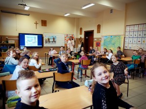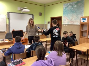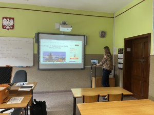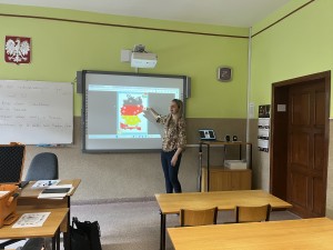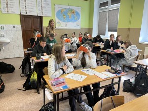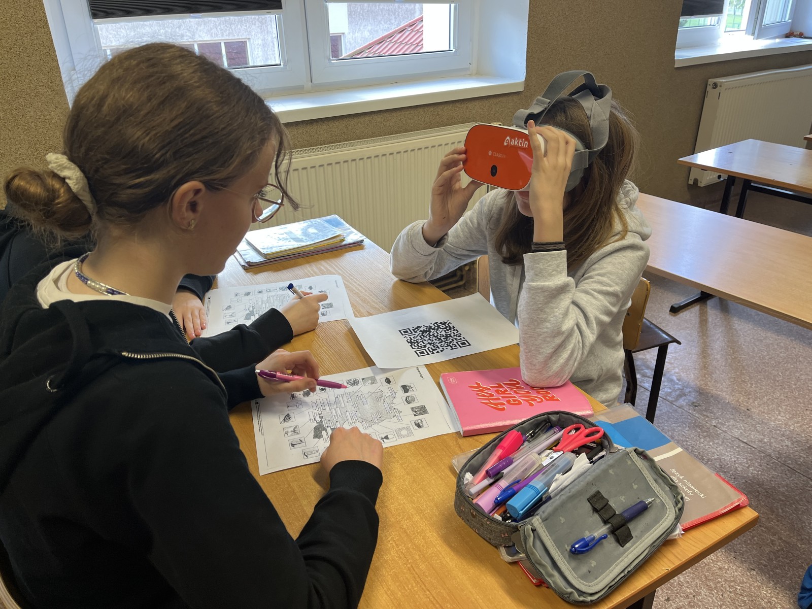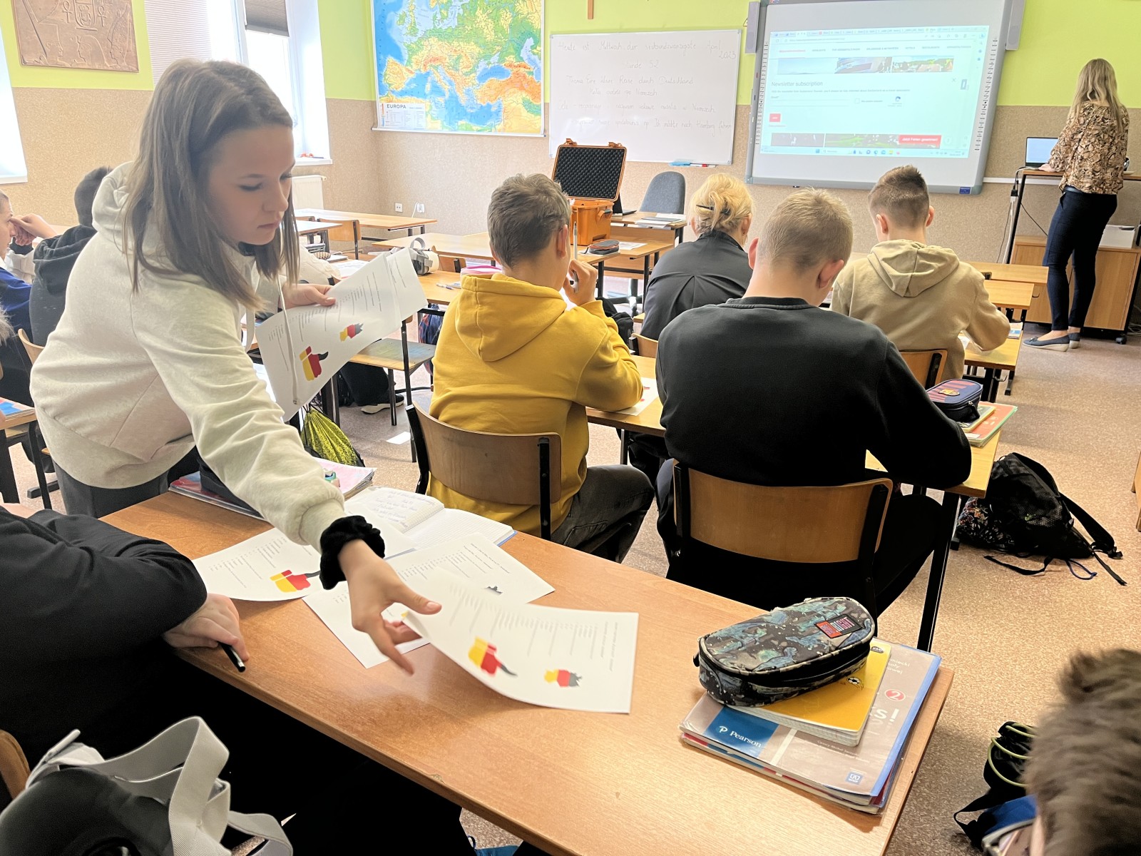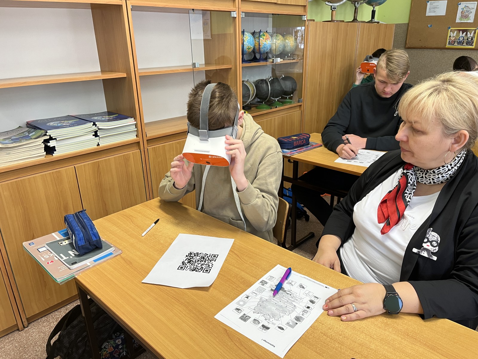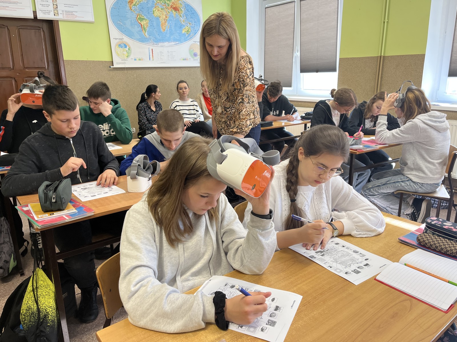W dniu 26 kwietnia 2023 r. odbyła się lekcja otwarta z języka niemieckiegodla nauczycieli w klasie VIIIb. Celem zajęć było zaciekawienie uczniów krajem naszych zachodnich sąsiadów. Uczniowie przenieśli się do wirtualnej mapy Niemiec, dzięki pozyskanym w ramach programu "Laboratoria przyszłości" okularom ClassVR Premium i odczytywali nazwy miast. Każde z nich może poszczycić się piękną architekturą i wieloma zabytkami. Kolejnym zadaniem był quiz do filmu " Was ist was- TV - Deutschland" w aplikacji Edpuzzle. Uczniowie dowiedzieli się wielu ciekawostek o Niemczech. Odpowiadali na pytania o powierzchni kraju, najwyższym szczycie, najdłuższej rzece itd. Ewaluacja dokonana pod koniec zajęć dowiodła, iż uczniowie z pewnością pogłębili swoją wiedzę geograficzną i historyczną o naszych zachodnich sąsiadach. Na lekcji wykorzystano materiały nabyte podczas kursy metodycznego w Ratyzbonie w ramach projektu Erasmus+.