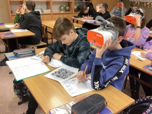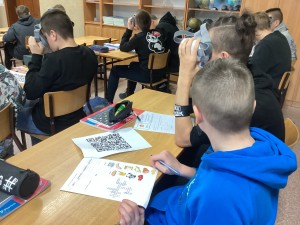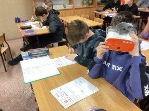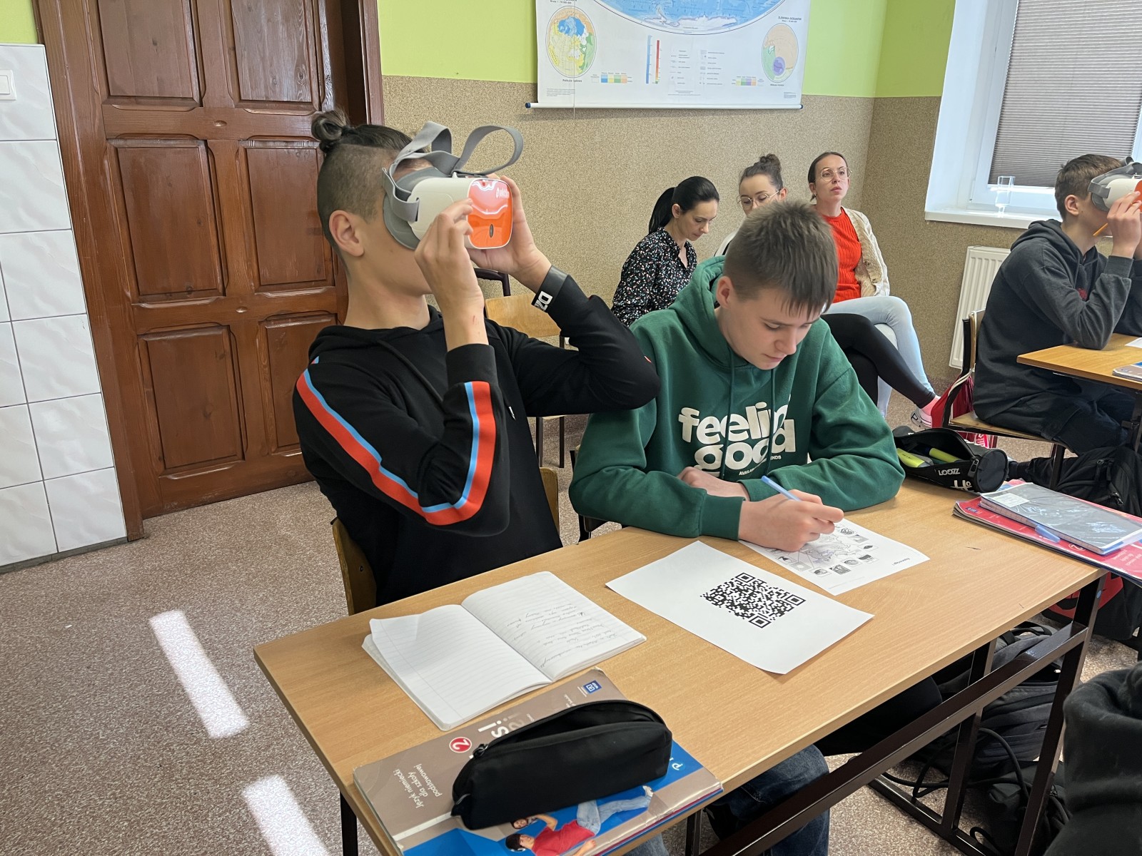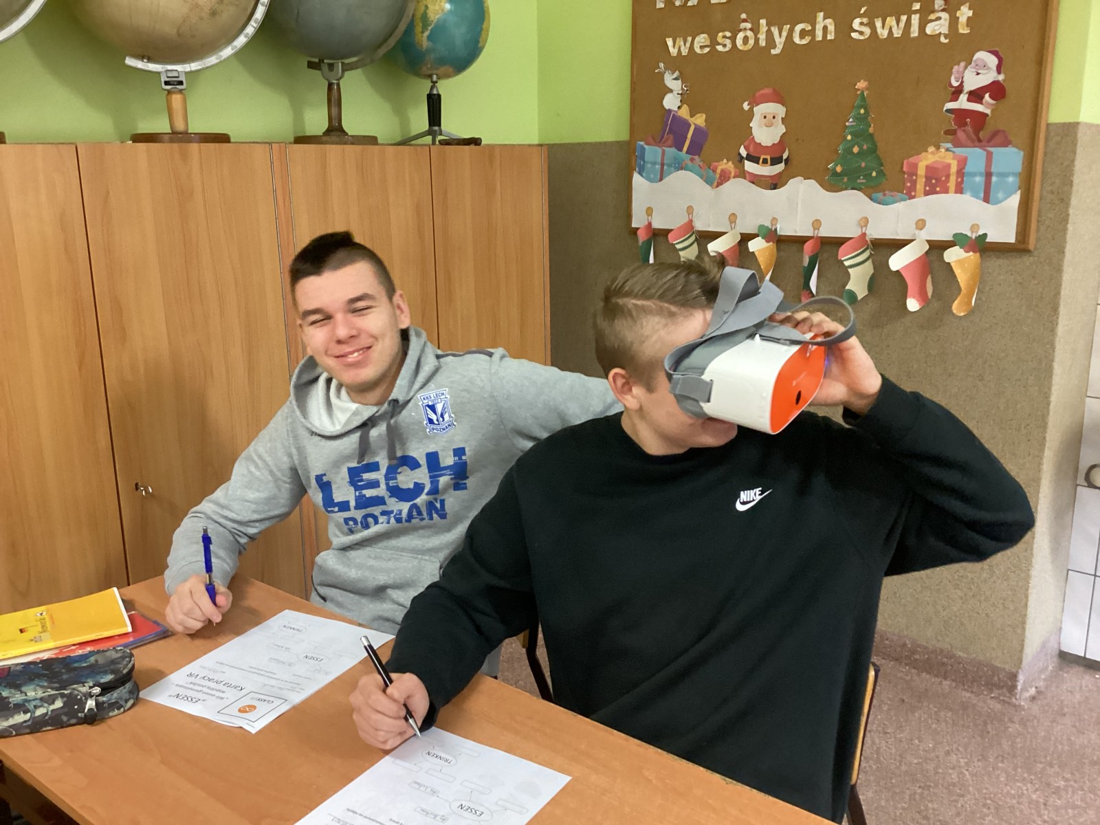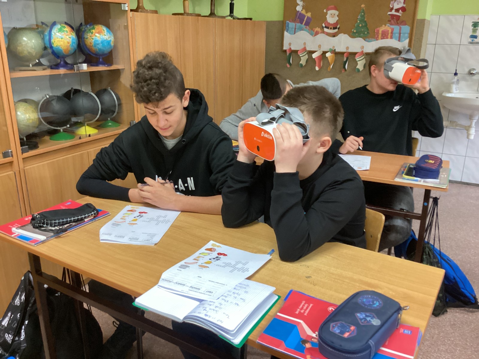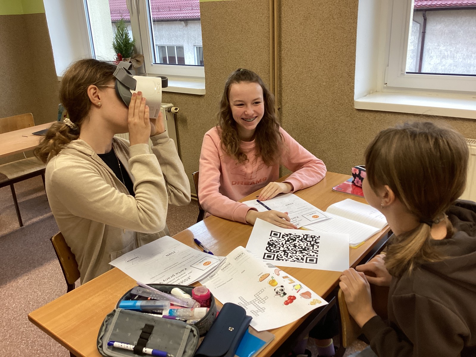 ESSEN und TRINKEN - wokół tematu związanego z jedzeniem i piciem odbyła się lekcja języka niemieckiego w klasie VIII b z wykorzystaniem nowoczesnego sprzętu - okularów VR. Karty pracy pozwoliły uczniom przenieść się do wirtualnej lodówki, wypełnionej artykułami spożywczymi. Poznane słownictwo wykorzystali w praktyce, bo czymże jest lekcja języka obcego bez kształtowania kompetencji językowych na materiale autentycznym. Umiejętność rozumienia ze słuchu ćwiczyli w aplikacji EDpuzzle, gdzie poznali Ninę - nastolatkę z Niemiec, która opowiedziała o popularnych daniach. Pod koniec lekcji uczniowie wypowiadali się ustnie na temat ulubionych potraw.